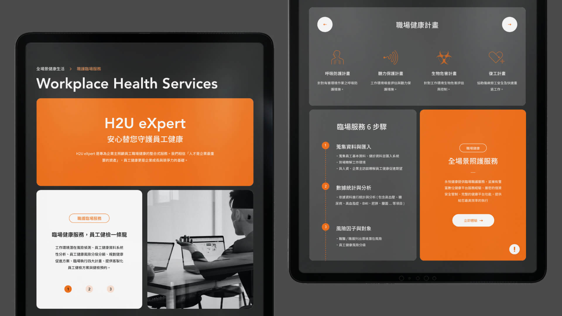 為體現 H2U 品牌精神與科技形象,我們以深色基底打造整體網頁視覺氛圍,輔以光束與線條設計語彙,呈現「黑夜中指引方向」的設計概念。網站資訊架構聚焦健康服務與生活內容,並導入簡報模組、動態區塊與可操作元件,兼具品牌宣傳與實用功能,為企業級健康品牌建立更具溫度與人性化的數位體驗。