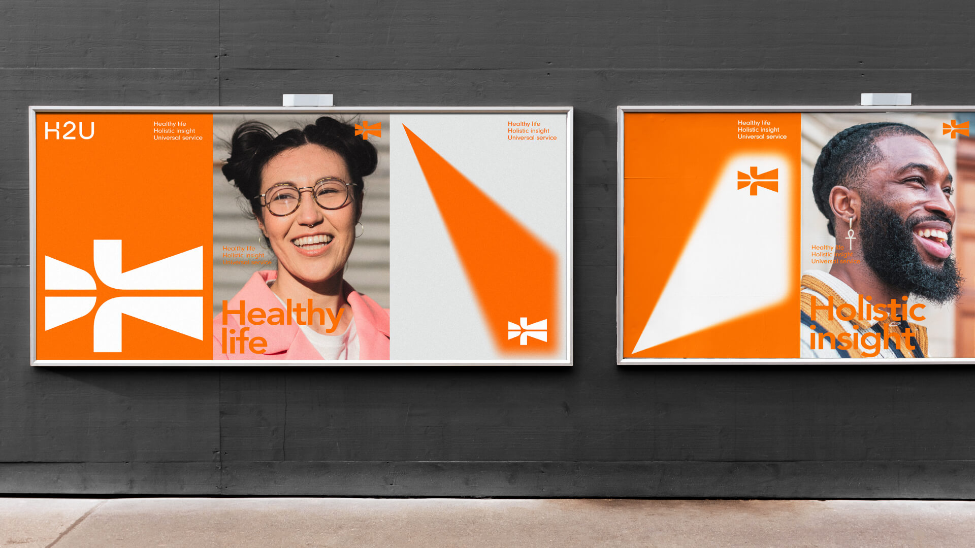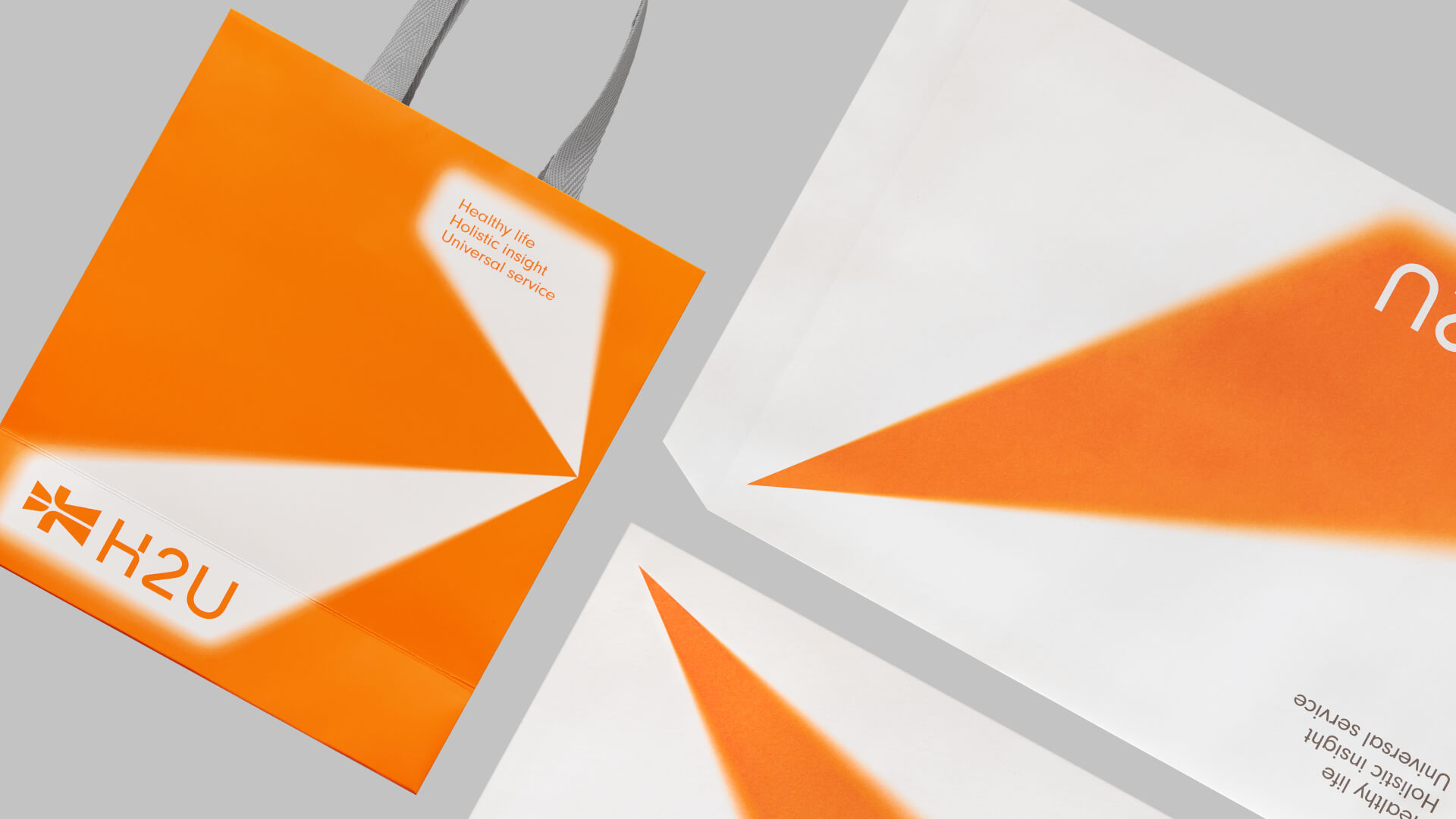 新Logo品牌識別設計延續原品牌旗幟意象,翻轉方向並轉化為象徵 360 度全場景服務的光束燈塔,傳達H2U品牌作為健康產業引路人的角色,在健康道路航行中帶領產業前進,同時也照亮消費者健康的光亮。