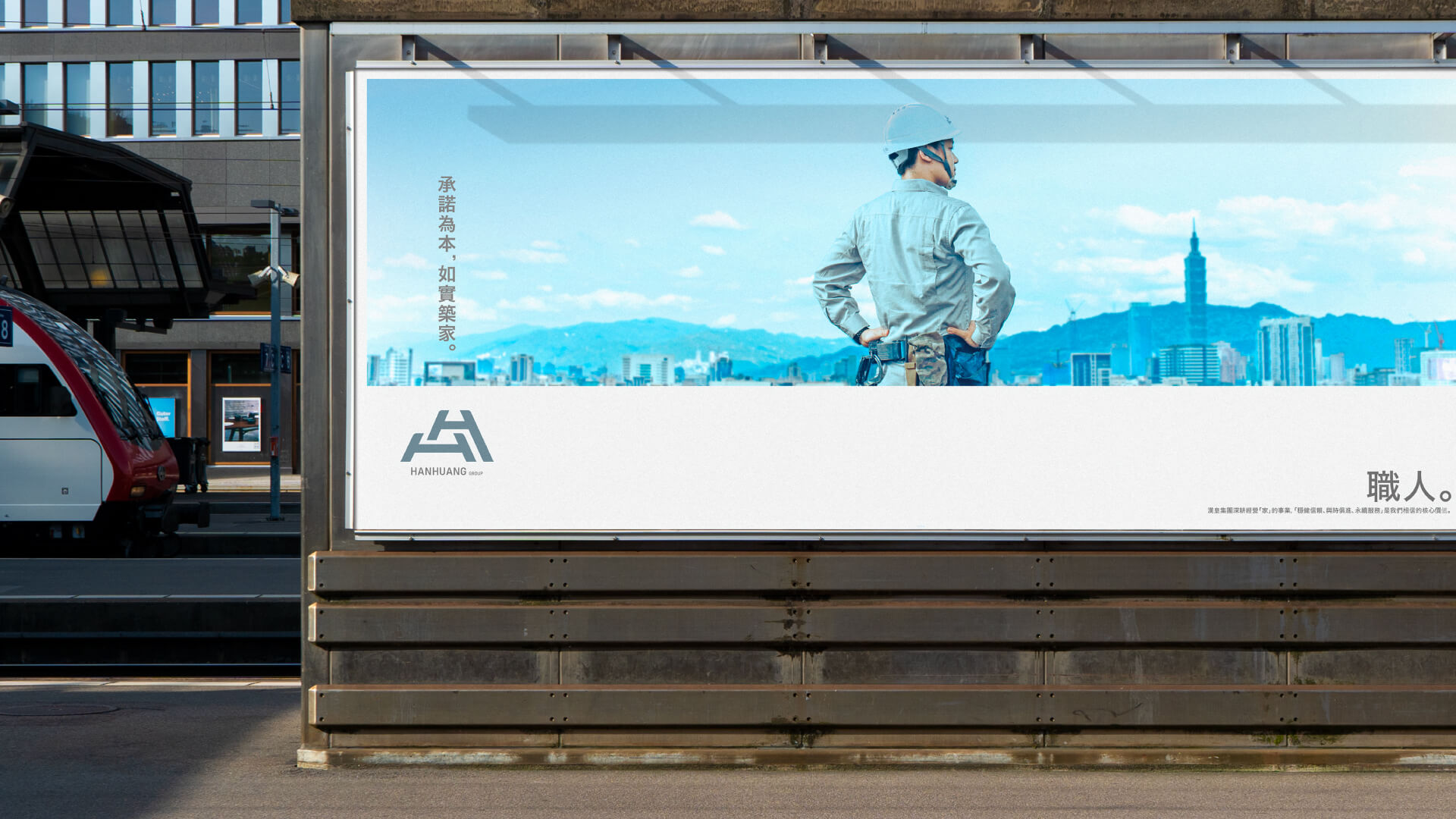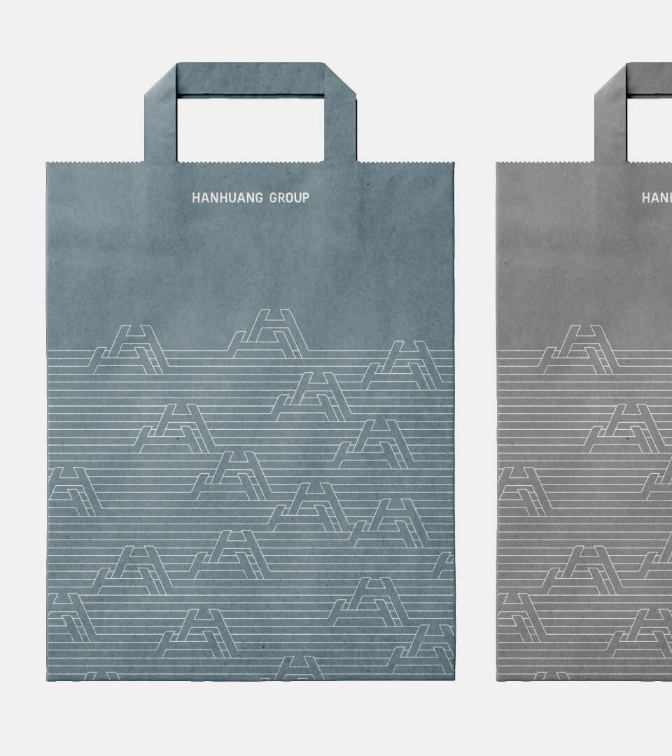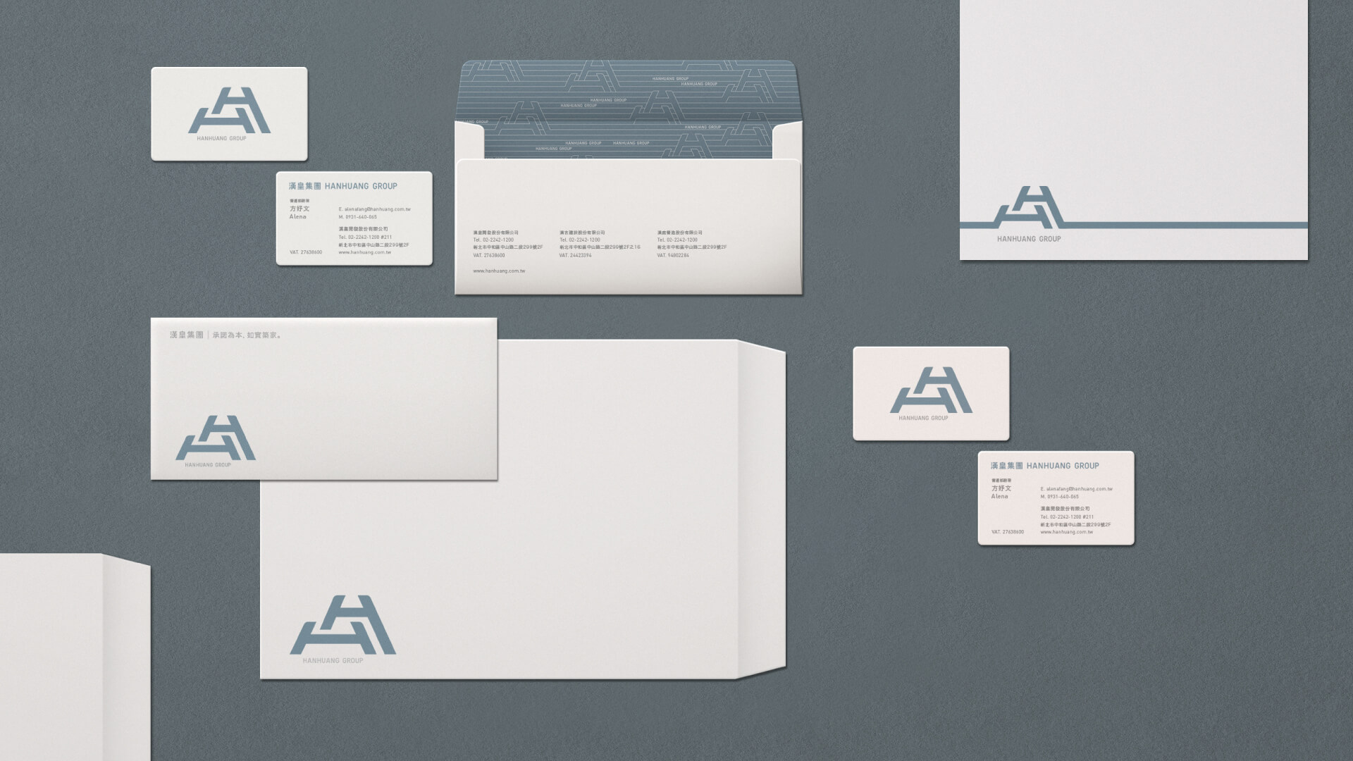 新識別概念取自品牌名稱「HAN HUANG」,以雙 H 字首轉化為穩定對稱的幾何結構,象徵企業穩固根基與向上發展的信念。圖形融合鋼構、山形與旗幟意象,傳遞建築專業與企業精神,色彩則選用沉穩灰藍,平衡專業感與人文溫度。整體設計簡潔、理性,展現現代集團的格局與視野。